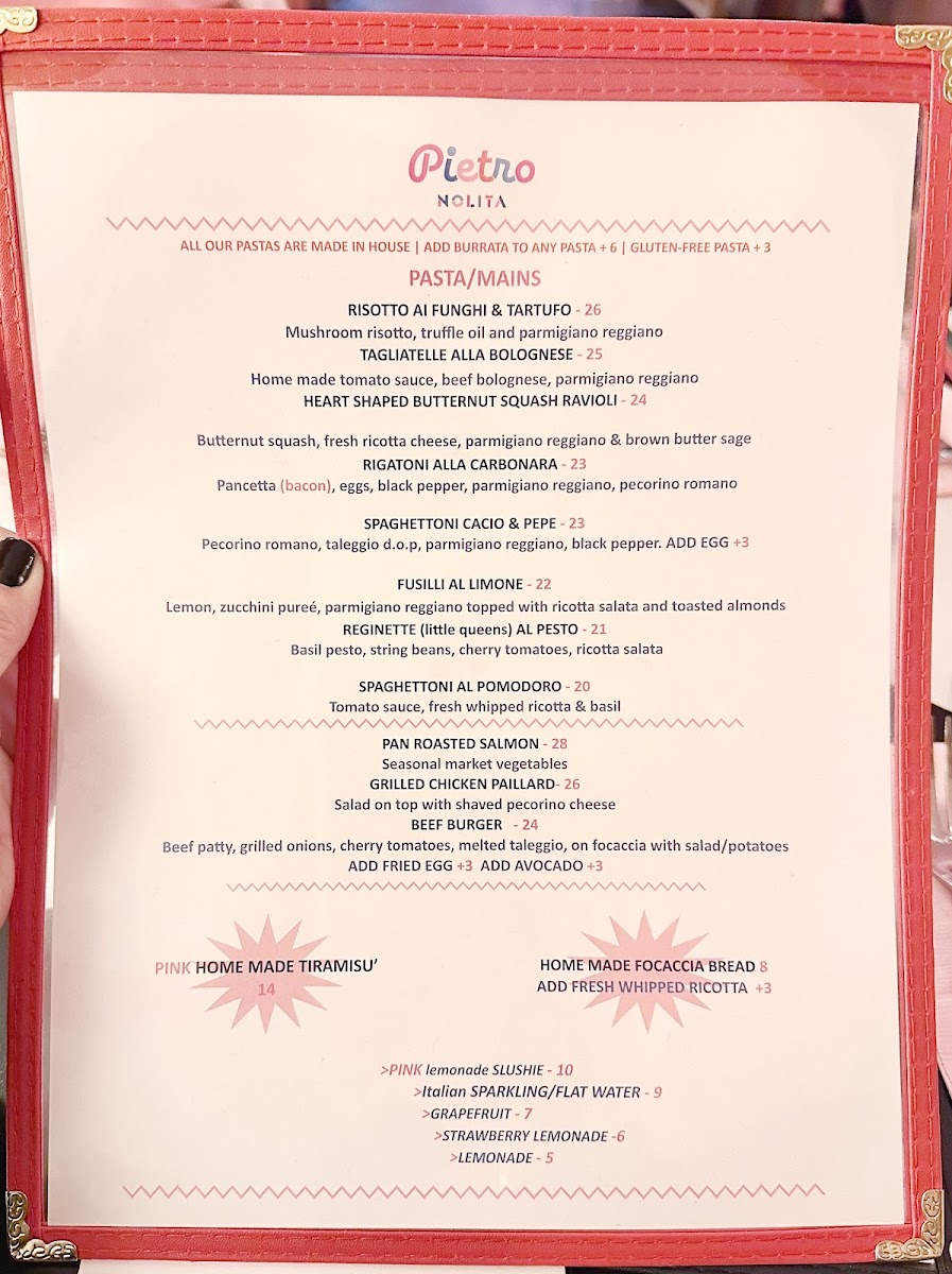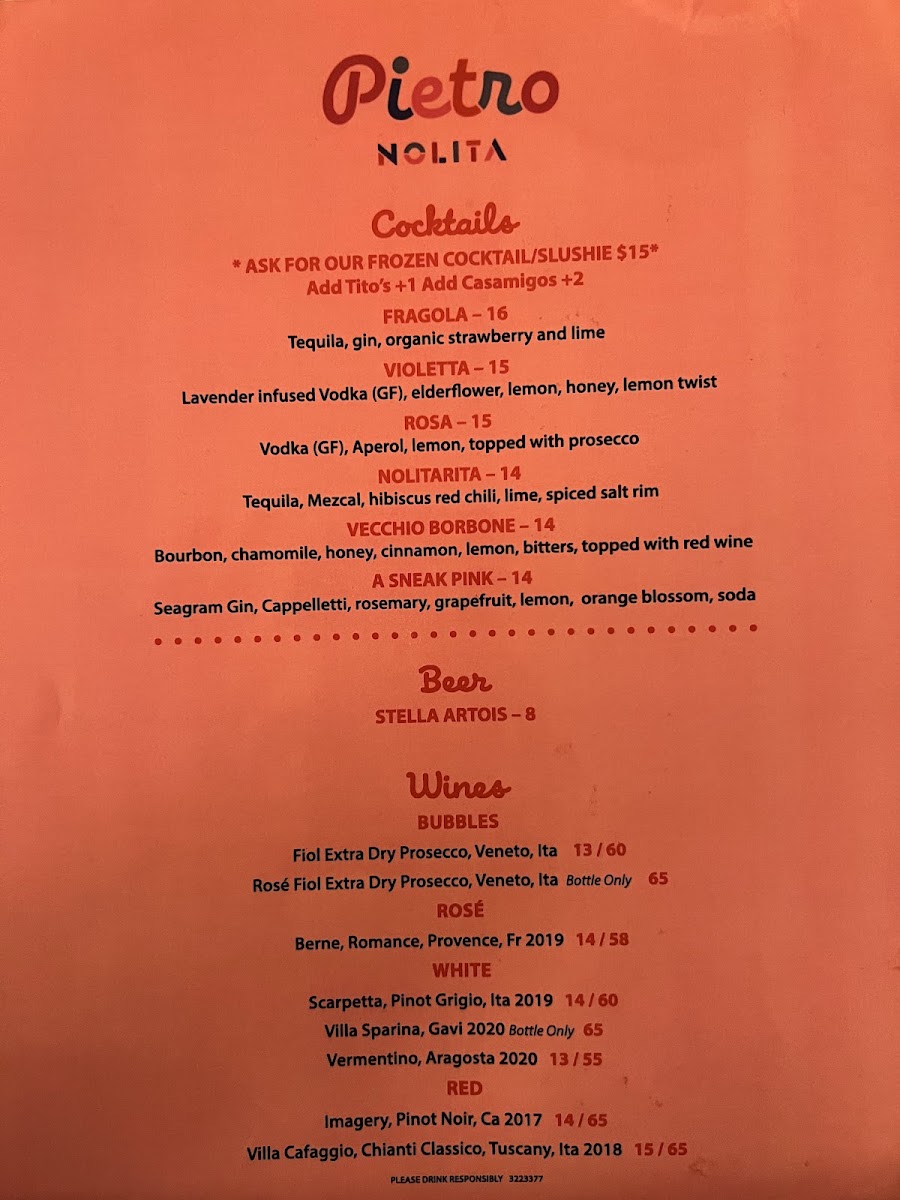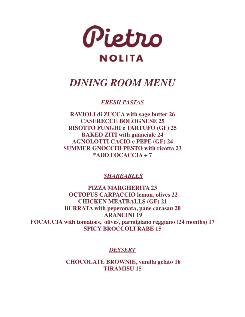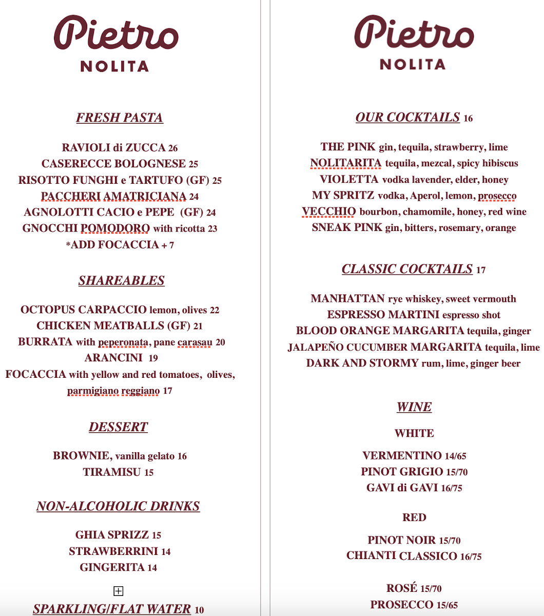 Pietro Nolita, nestled in the heart of Nolita, New York, invites you to experience a delightful fusion of authentic Italian flavors and modern charm. The menu boasts a range of handmade pastas that will tantalize your taste buds. Highlights include the RAVIOLI alla ZUCCA with a sumptuous pumpkin sauce and the rich CASERECCE alla BOLOGNESE, crafted with homemade tomato and beef Bolognese. For those seeking a gluten-free option, the RISOTTO ai FUNGHI e TARTUFO is a must-try with its earthy mushroom and truffle notes.