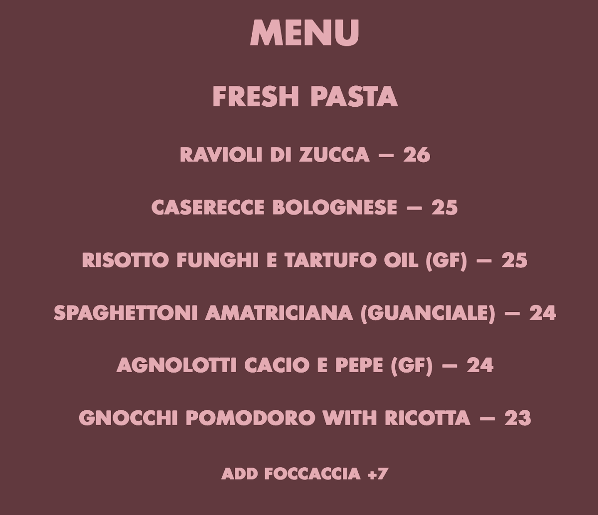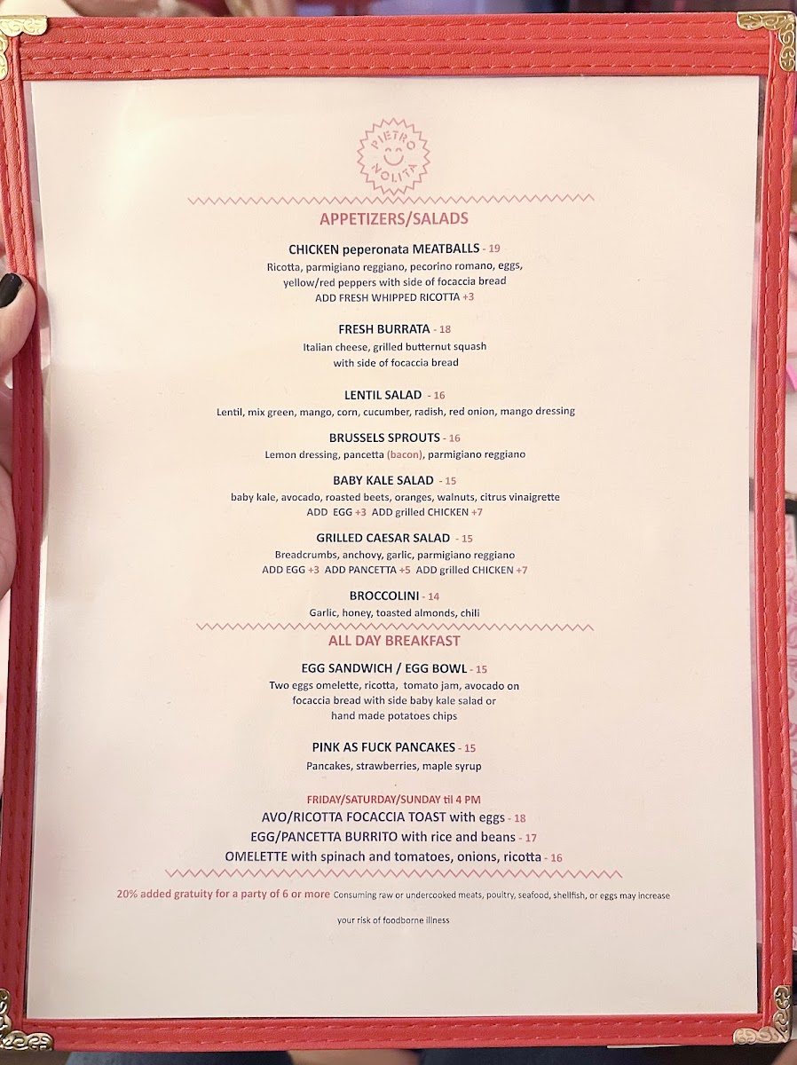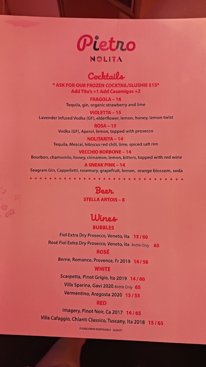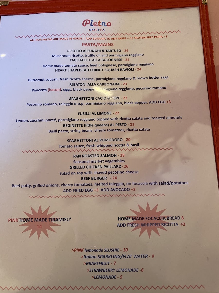 Pietro Nolita, nestled in the heart of Nolita, New York, invites you to experience a delightful fusion of authentic Italian flavors and modern charm. The menu boasts a range of handmade pastas that will tantalize your taste buds. Highlights include the RAVIOLI alla ZUCCA with a sumptuous pumpkin sauce and the rich CASERECCE alla BOLOGNESE, crafted with homemade tomato and beef Bolognese. For those seeking a gluten-free option, the RISOTTO ai FUNGHI e TARTUFO is a must-try with its earthy mushroom and truffle notes.